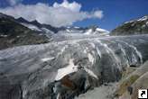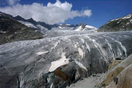 Aussicht auf den Rhonegletscher und die 4000er der Berner Alpen. Hinab