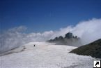 während ein paar Ganzjahreswintersportler mit Showboards die Gletscherpiste