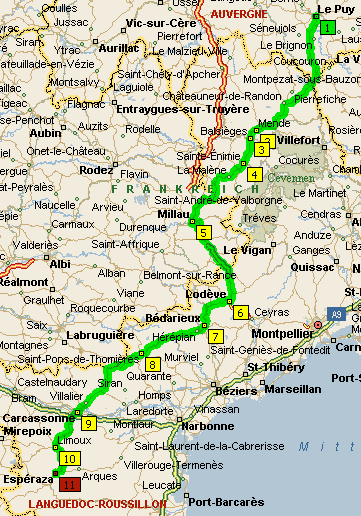 Le Puy - Mende - Balsièges - Sainte-Énimie (Tarn-Schlucht) - Millau - Lodève - Bédarieux - Saint-Pons-de-Thomières - Carcassonne - Limoux - Esperaza.
